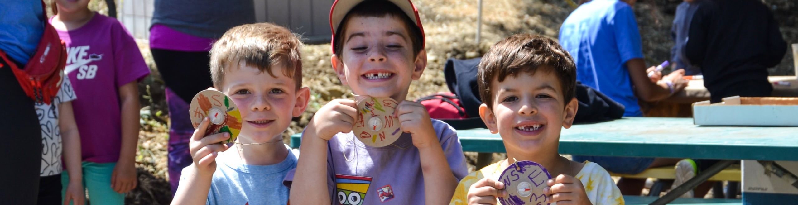 Three young boys stand outdoors, smiling and holding up decorated wooden crafts while other people sit and work at a picnic table in the background.